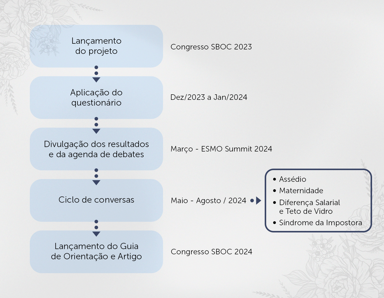 Com base nos resultados levantados por essa pesquisa, o projeto Mulheres na Oncologia realizou uma série de debates virtuais sobre alguns temas de impacto na vida e carreira das oncologistas: assédio, maternidade, teto de vidro e diferença salarial. As discussões serviram de base para o lançamento do guia “Liderança Feminina SBOC” (confira abaixo), realizado durante o Congresso SBOC 2024.